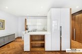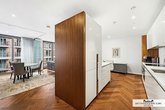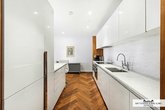 The apartment is bright and spacious, featuring elegant parquet flooring, high ceilings, and a stylish open-plan living area that flows seamlessly into a charming winter garden.